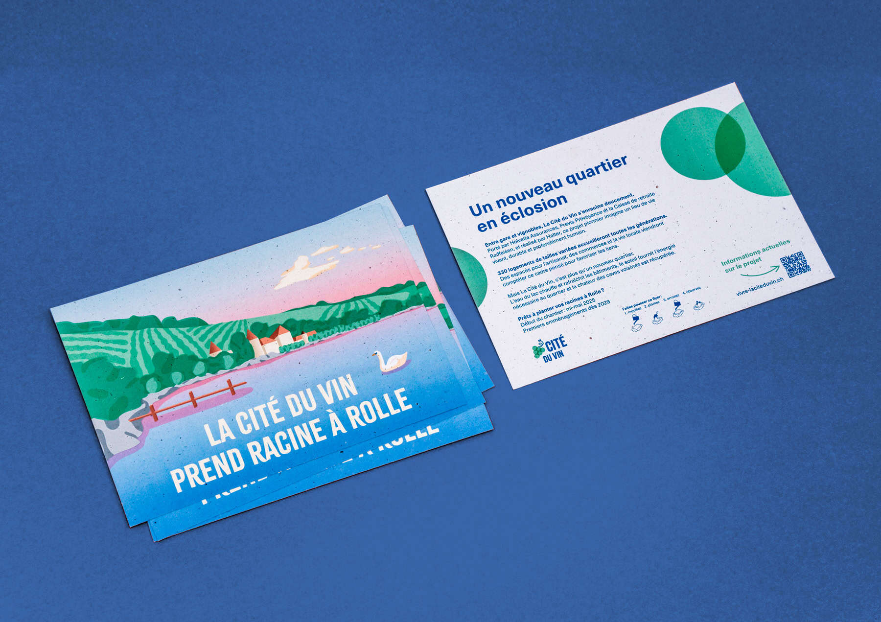 Für Cité du Vin, das entstehende nachhaltige Quartier in der Gemeinde Rolle, entwickeln wir die gesamte Kommunikation und das Design. Zuletzt ein Flyer, der nicht im Abfall, sondern in der Erde landet.